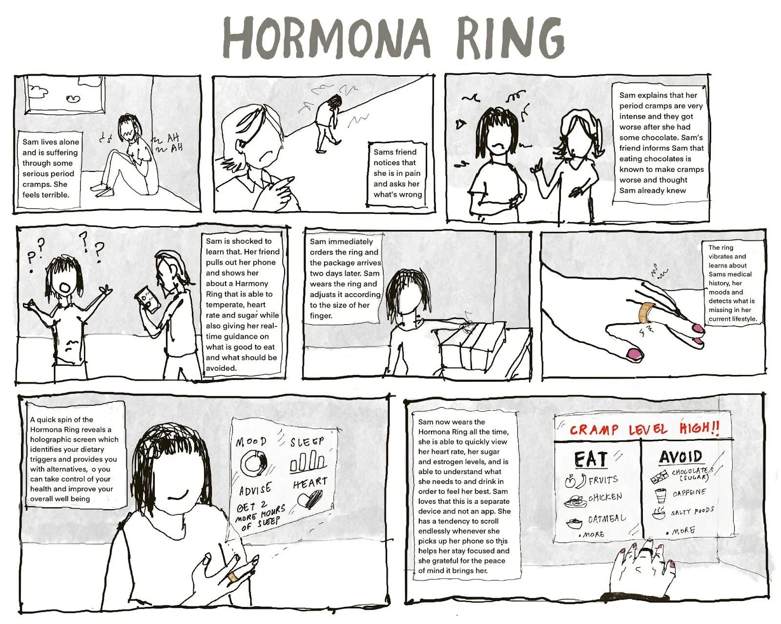These concept stories were then used in a follow-up round of user interviews, where women with hormonal imbalances provided feedback on their preferences and potential concerns with the conceptual solutions.