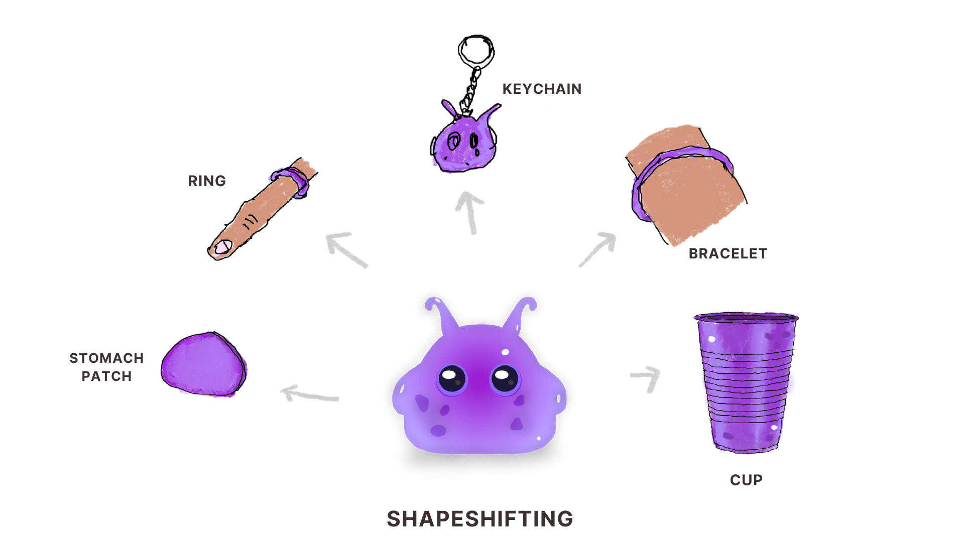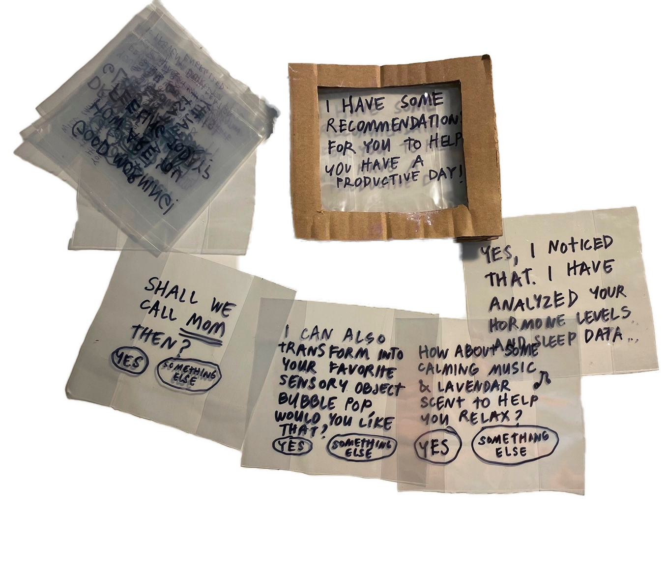 For our first prototype, we will focus on visually representing the future technology. During concept testing, many questioned how a hologram would look and effectively communicate data. Security concerns were also raised but are beyond the scope of this prototype. We will use clay to create a sensory-friendly, moldable version of the Huffle character, showcasing its shapeshifting ability by presenting it in multiple forms, such as a bracelet or compact object. To simulate data tracking and the hologram feature, we’ll use clear plastic sheets with written data examples, flicking between them during testing to demonstrate user interaction with Huffle.